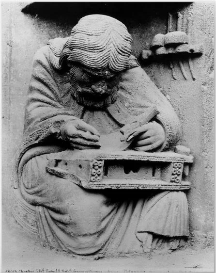 The figure of Pythagoras studying the divine laws of harmony, Chartres Cathedral, Royal Portal, west façade, right doorway tympanum, under the figure of the Virgin inside a Vesica Piscis.