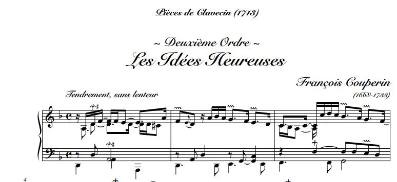 Les idées heureuses, a harpsichord piece by Couperin, published in 1713, depicted in his portrait. Contrary to its title, “Happy Thoughts”, this music reflects a rather melancholic mood. Apparently it was the work that he was particularly fond of.