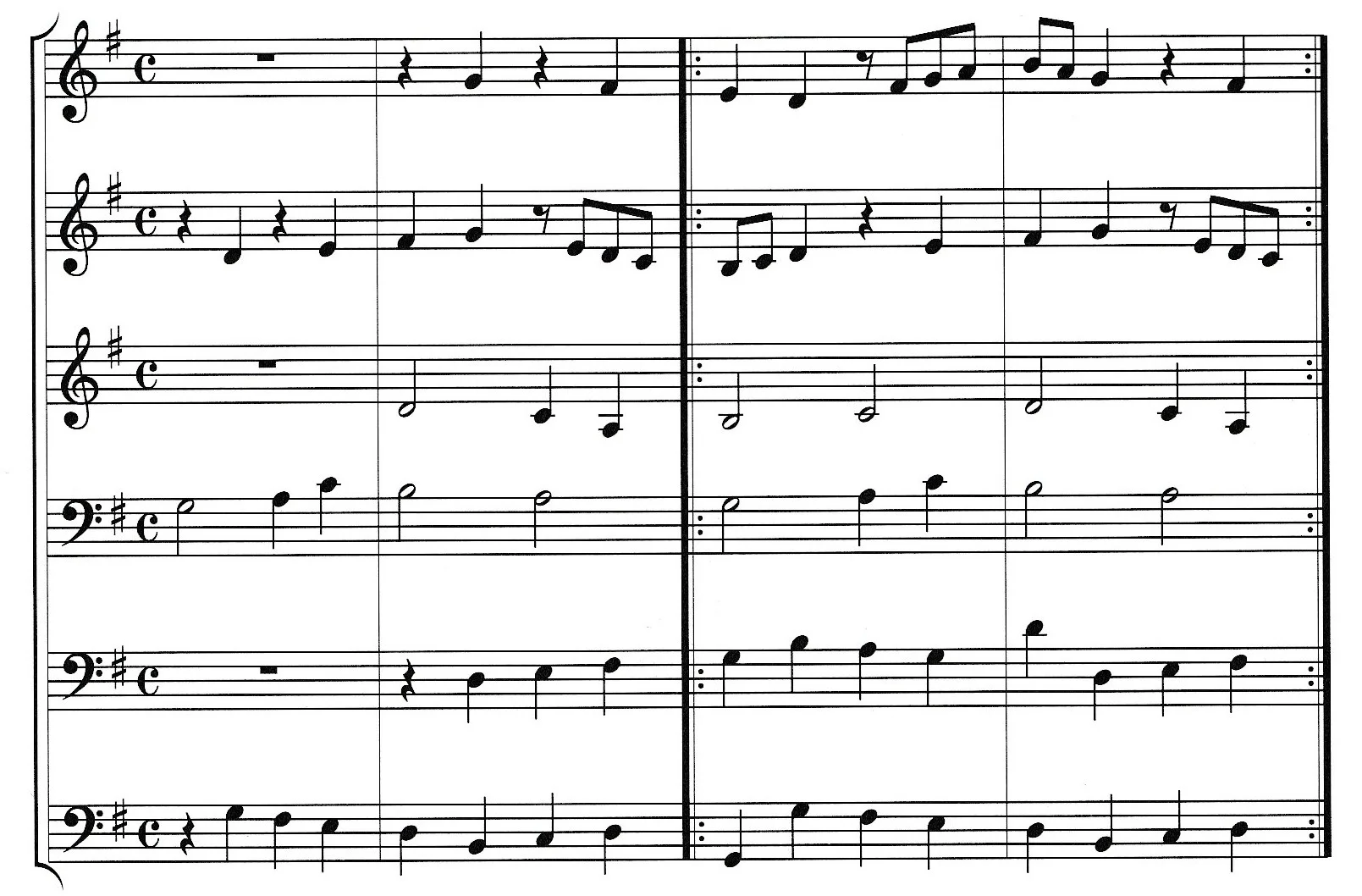 Indeed, it seems that in this portrait, Bach offers this canon for us to decipher: the way he holds the score sheet, turned towards the viewer, and lets us read it easily. All the three voices of the canon are written by the composer himself, and even in this form this piece is already harmonious. This canon is called ‘triple,’ because each of the voices, in its turn, constitutes a theme for a separate two-voice canon. In other words, by finding the right counterpoint (i.e., the fitting melody) to each of these melodies, we will first get three separate canons. The only clue that Bach gives are the moments when these voices need to start, but it still remains unknown which of the many existing rules needs to be applied in order to find just the right counterpoint.