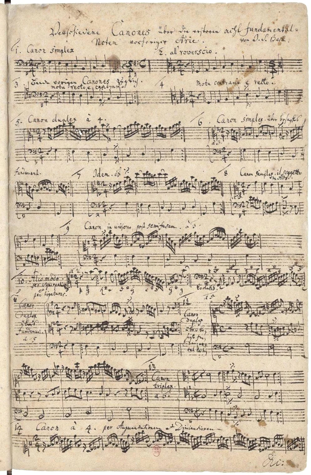 J.S. Bach, Verschiedene Canones über die ersten acht Fundamental-Noten vorheriger Arie (Various Canons on the First Eight Fundamental Notes of the First Aria), from the Goldberg Variations, BWV 1087, composed between 1741 and 1750, discovered in Bach’s own copy of the Variations in 1974. The score is stored at Bibliothèque Nationale de Paris.