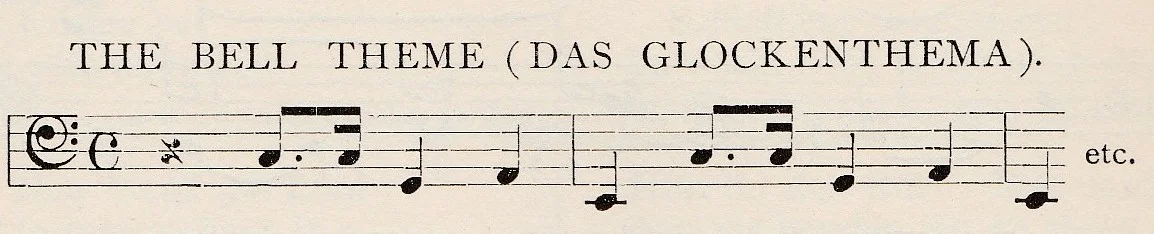 Consider the part played by the strings and the bass clarinet in the colouring of these pictures! Recall the storms in Die Walküre, the scene of the Nibelheim in Das Rheingold and in Siegfried the scene of Wotan and that between Alberich and Mime before the Dragon's cave (see below) – are they not so many dark pages, intensely black and mysterious, in strong contrast with the preceding or the following scenes, that are illumined by the brilliant orchestral colour and the feverish inspiration of the melody?