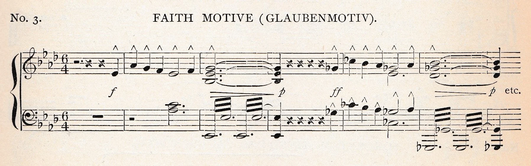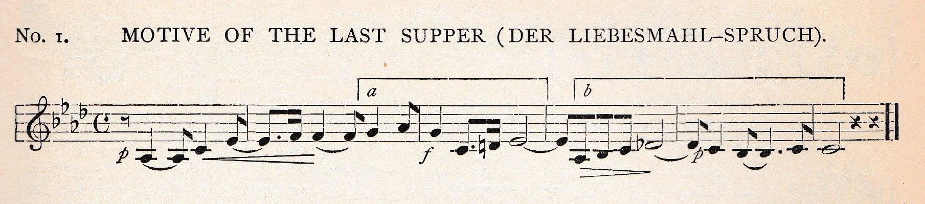The supper-theme is interpreted again by the orchestra, with all its wealth of sound. Little by little these musical splendors die away; the knights rise, the feast begins, with the songs of the knights alternating with those of the children and youths; the knights then solemnly leave the Temple after the feast, while the tabernacle of the Grail is being removed. Once more the orchestra, having unfolded the theme of faith, takes up the motive of the first march.
