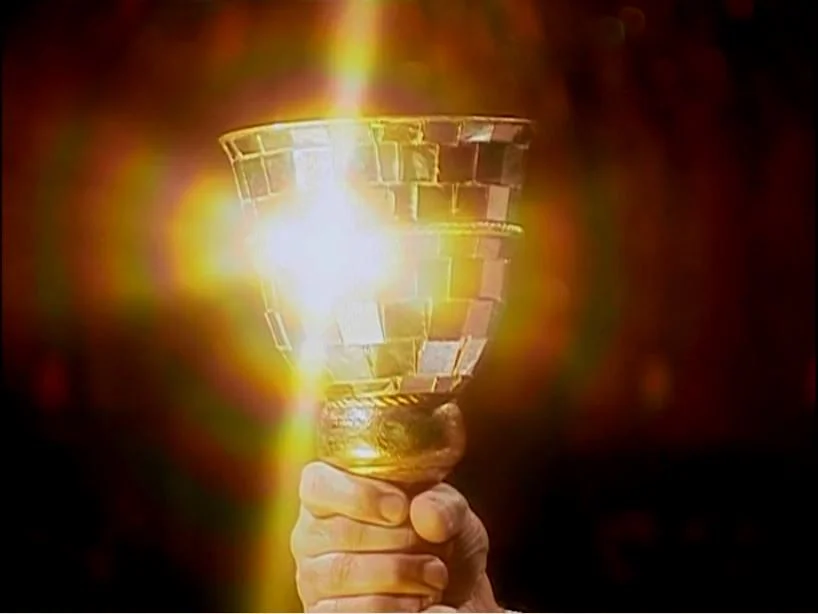 As Amfortas slowly raises the Grail cup and the scales above the kneeling knights, the darkness is replaced by a dazzling light which falls upon the sacred cup, and is refracted by it into a thousand brilliant coruscating rays.