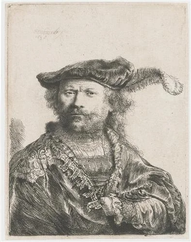 Rembrandt, Self-Portrait in Velvet Cap with Plume, etching, 1638, Metropolitan Museum of Art, New York