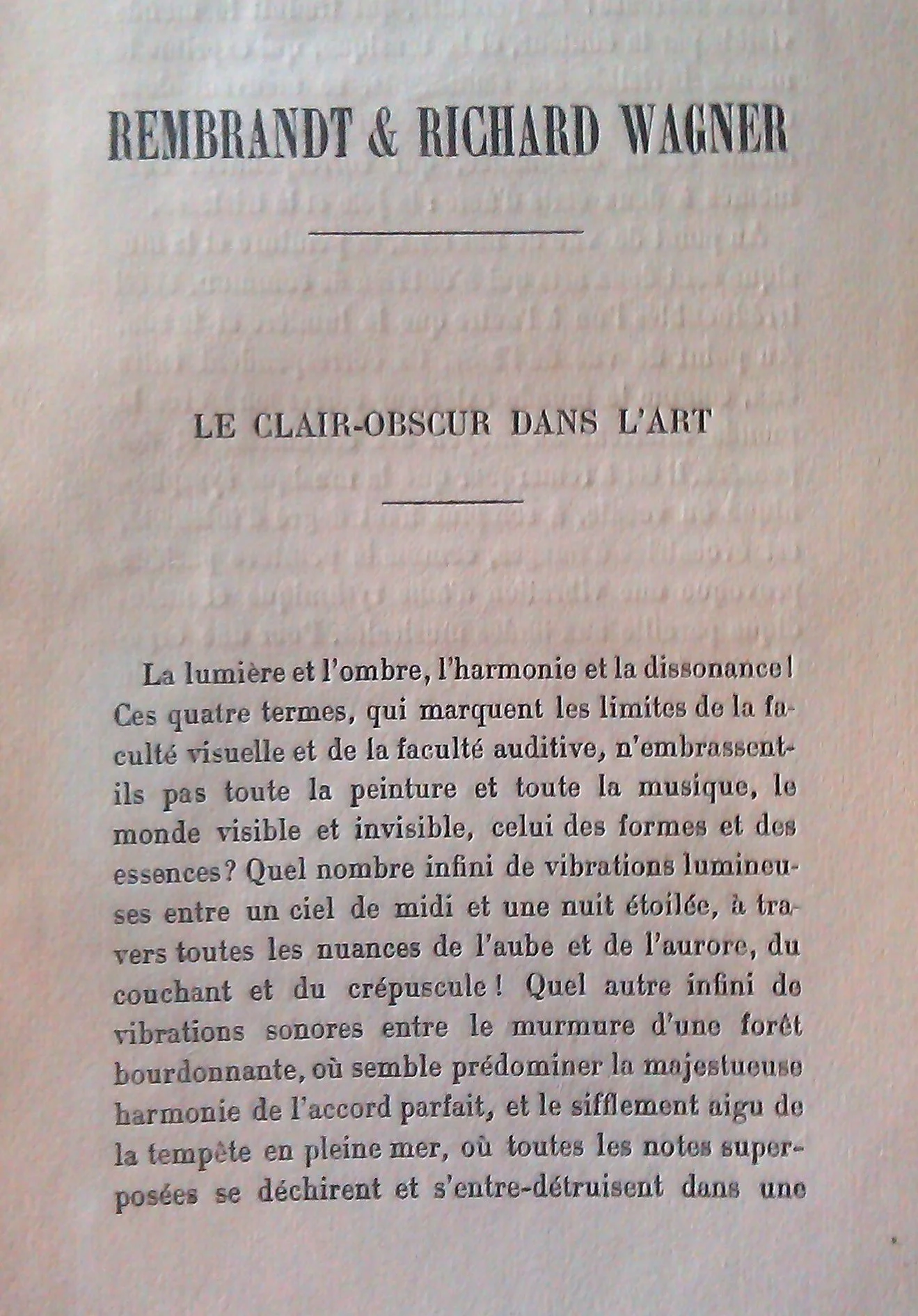 The originality of painter and musician are shown in the way in which they oppose light to shade, harmony to dissonance. In this, Rembrandt and Wagner can be considered brothers, not because they are identical in every detail, but because their temperaments are so much alike. They show the same contempt for hackneyed methods, the same yearnings for new ones, the same delight in rare and intense sensations. But the strongest link between them is that wonderful gift they both possess of awakening in us the sense of external life, of stirring the inner man by effects that are both delicate and violent, of bringing, as it were, the soul into light, by a clash between light and shade.